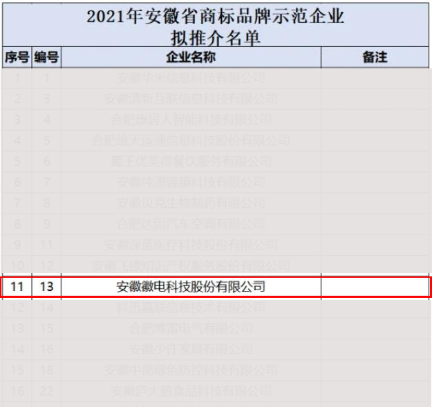 近日,經(jīng)安徽省商標品牌示范企業(yè)推介委員會及專家評定、公示,徽電科技被授予“安徽省商標品牌示范企業(yè)”稱號。