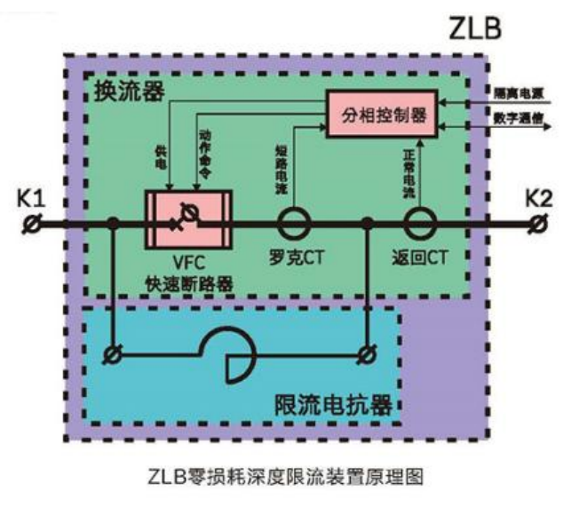 隨著各類型用電企業的發展壯大,用電負荷大舉攀升,各企業電網系統的短路電流已經接近或達到負載側真空斷路器的最大使用極限,企業面臨真空斷路器開斷容量不足,變壓器抗短路電流沖擊能力不足等問題,已經嚴重威助了企業的安全運行。我公司根據市場發展需求,開發出零損耗深度限流裝置(簡稱 ZLB),其結構由 VFC 快速渦流驅動開關與深度限流電抗器并聯組成,具有運行時無損耗、無壓降,短路時限流能力強且可自動復位等特點。